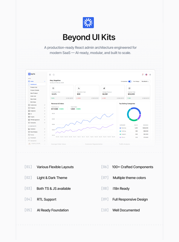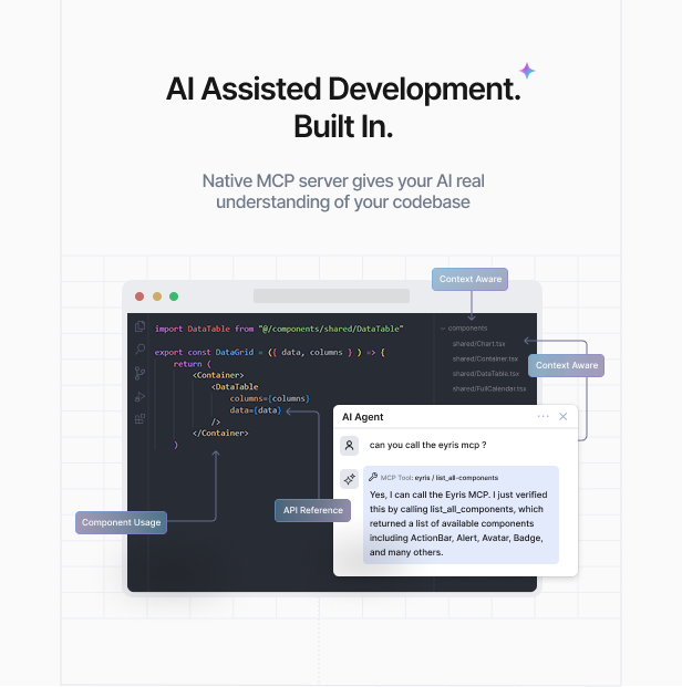 Whether you’re building a SaaS platform or an internal dashboard, Eyris delivers the right balance of aesthetics, flexibility, and developer experience. You get light and dark mode, RTL support, muilti-language support, various layout options, powerful chart widgets, clear documentation and MCP server integration — enabling AI agents to understand and use the template directly in your project.