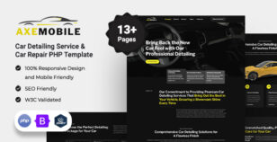 Axemobile is a professionally designed HTML and PHP template built specifically for automotive detailing and car repair services. Ideal for car detailers, auto workshops, vehicle maintenance centers, paint correction professionals, ceramic coating providers, and other auto care businesses looking to establish a professional and impactful online presence. Crafted with modern design principles and developed using